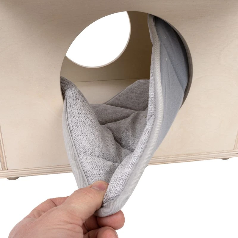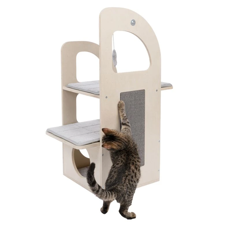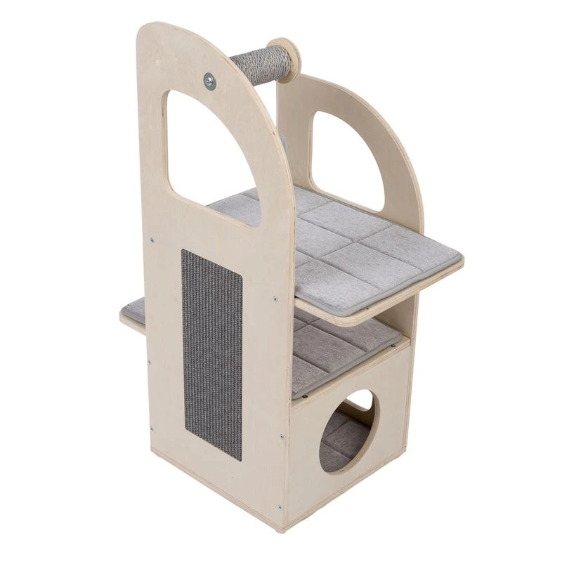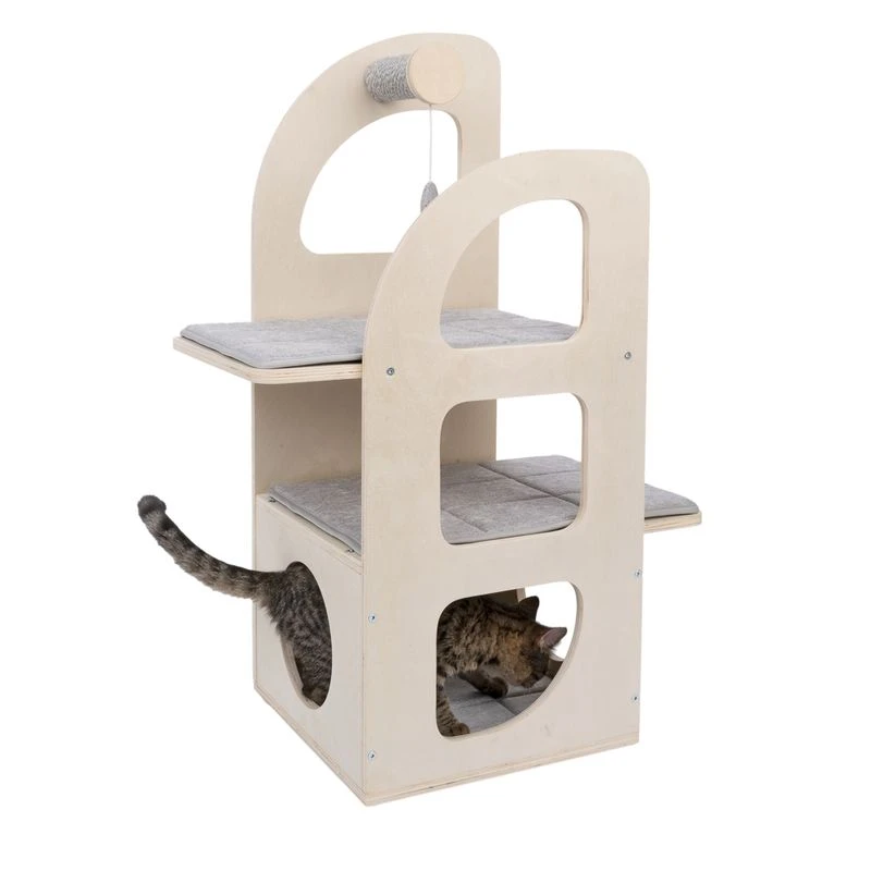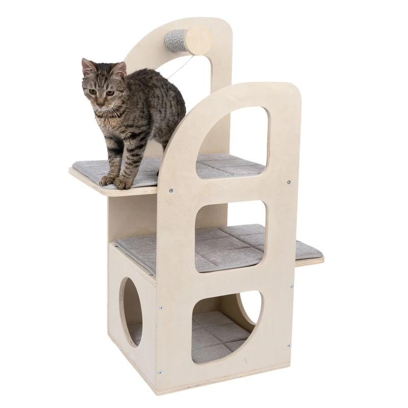 The TIAKI Aidan Cat Tree has a unique, modern shape that makes it stand out from the crowd when it comes to cat furniture. It is made from a light-coloured veneer wood and consists of three levels that will keep your pet entertained for hours! The removable cushions on all three levels are covered with a soft, grey upholstery fabric and can easily be machine-washed if necessary.