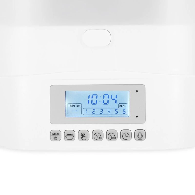 Dry food dispenser for cats and smaller dogs, fits up to 6 meals with 24 portions each programmable.  With voice recording function and airtight container. Includes desiccant.
