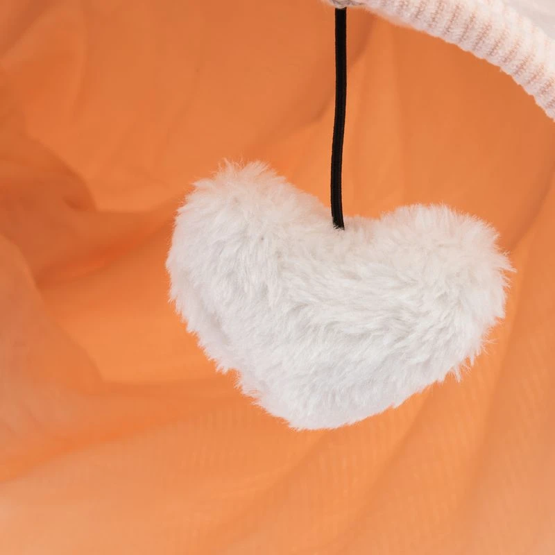 Cat tunnel made from soft corduroy material. The tunnel is non-slip and does not crinkle. It also features a removable plush play top with dangling toy hearts, and it can be folded up for space-saving storage.