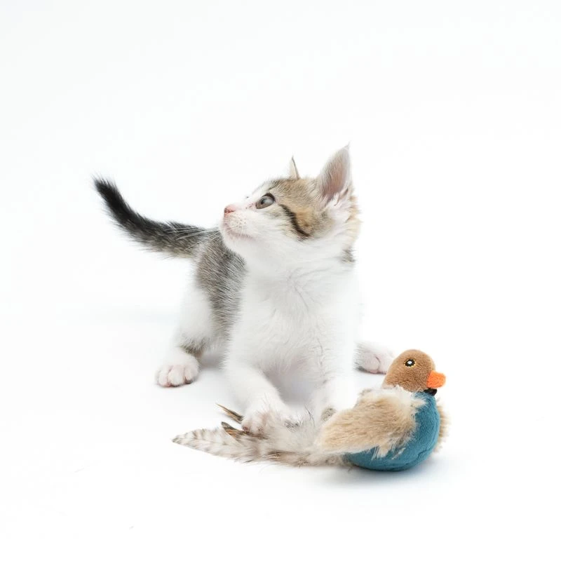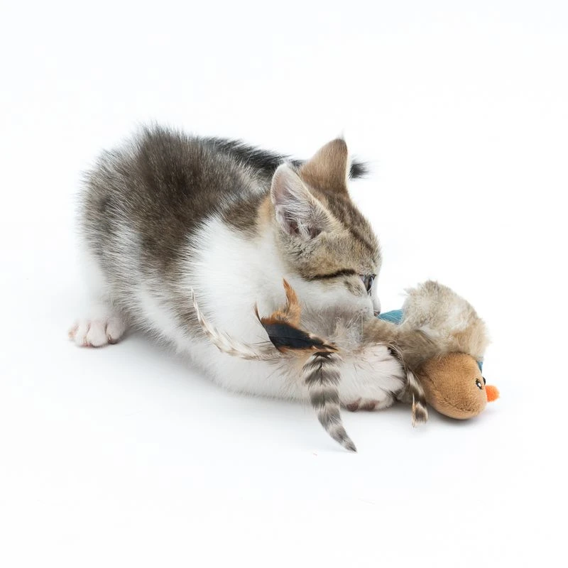 The colorful bird is sewn from various plush fabrics and adorned with real feathers, making it nearly irresistible to any cat, both for cuddling and playing. The soft texture and feathers give the toy a realistic touch that your cat will simply love.