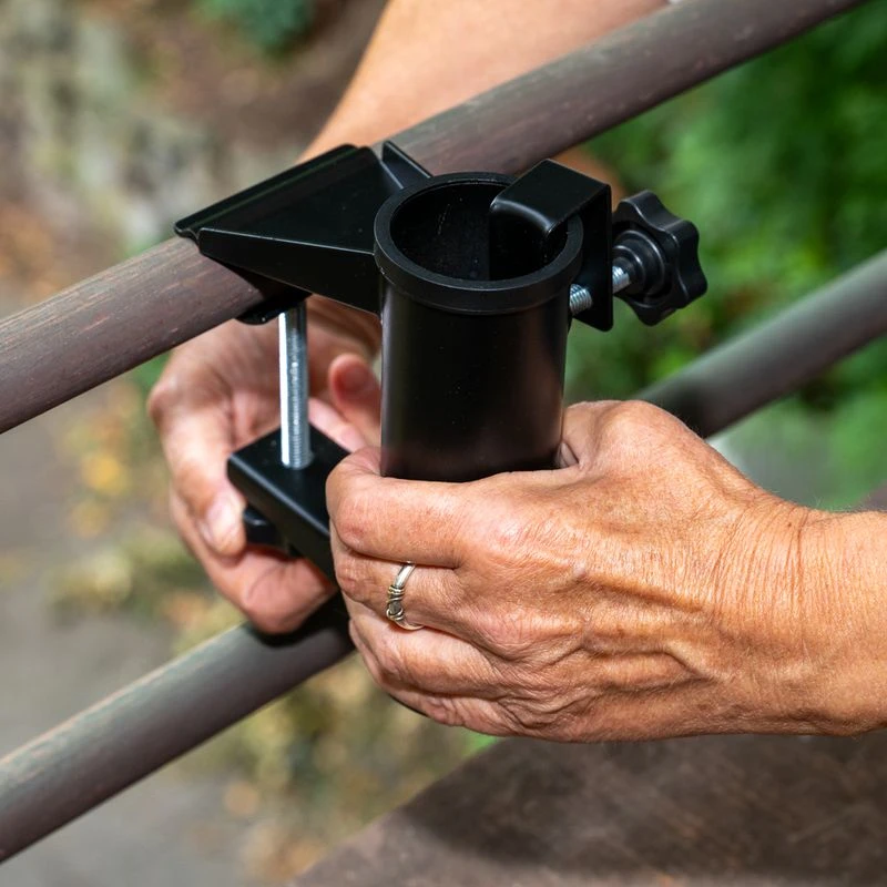 Sturdy railing clamp for telescopic poles, attaches to balcony railings or protrusions, made of sturdy iron. Compatible with poles up to 5cm and can be combined with other TIAKI products.