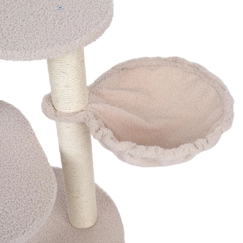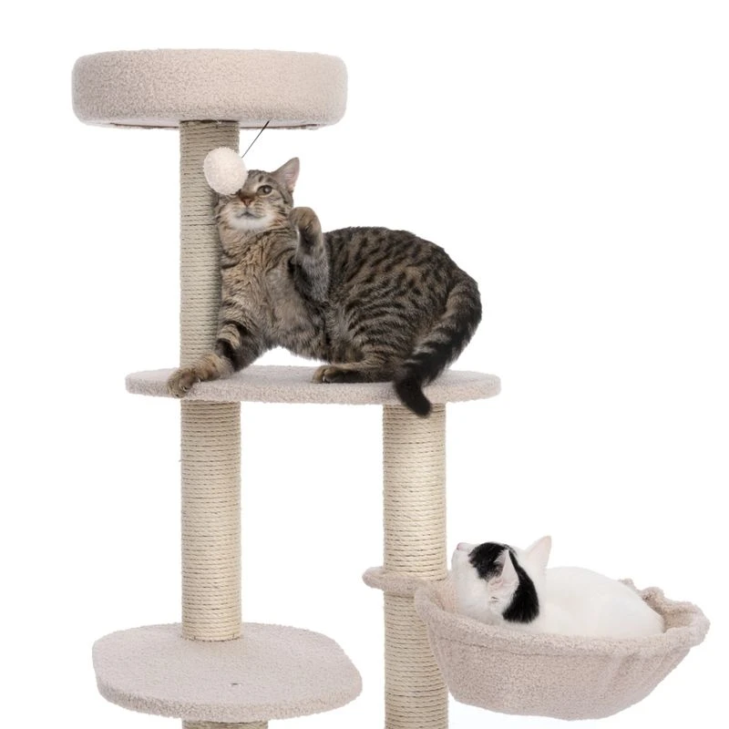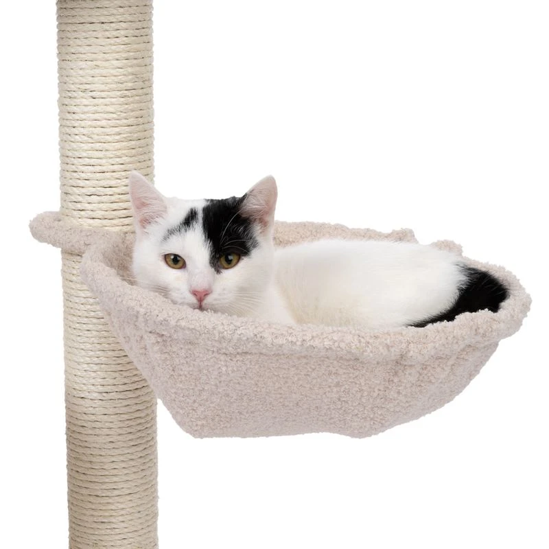 The TIAKI Shearly Cat Tree has a round cosy bed and a hammock in which your cat can curl up in luxurious comfort. The tall sisal posts invite to go all out with the claw sharpening. There is also a small rattling plush ball on the cosy bed to encourage to play. The round base plate keeps the cat tree securely in position.