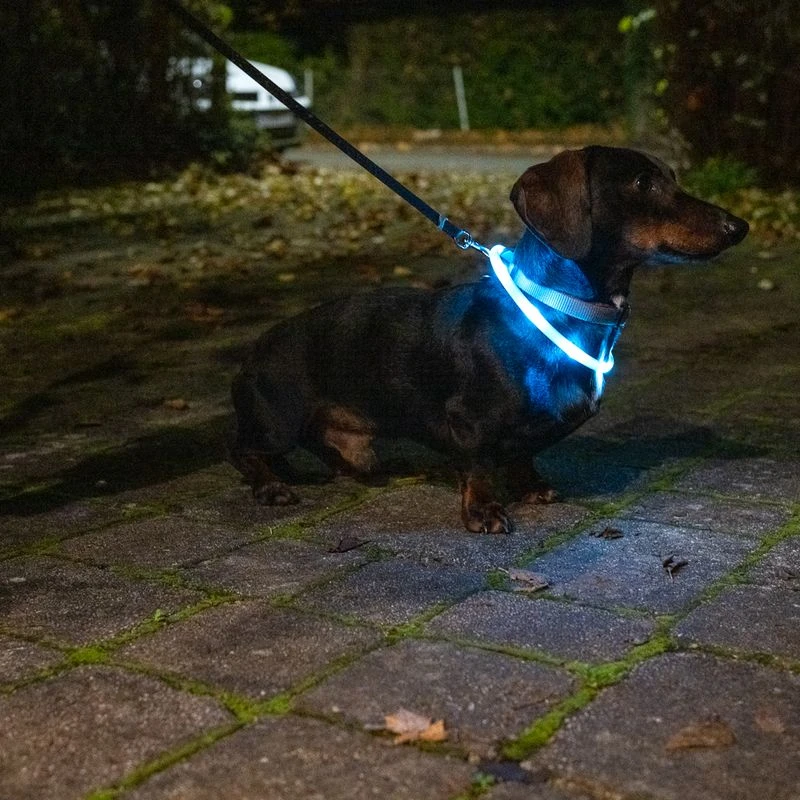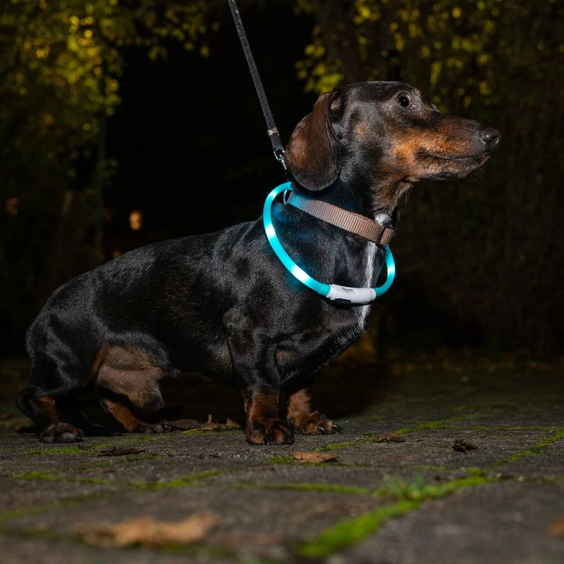 The TIAKI Small USB LED Lantern Silicone Collar is the ideal solution for keeping your four-legged friend visible and safe in the dark. This versatile LED ring fits both dogs and cats and can easily be cut to the desired size. Once charged, it offers up to four hours of reliable lighting power with its various light modes – from continuous to rapid flashing.