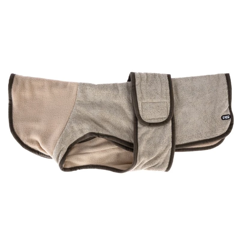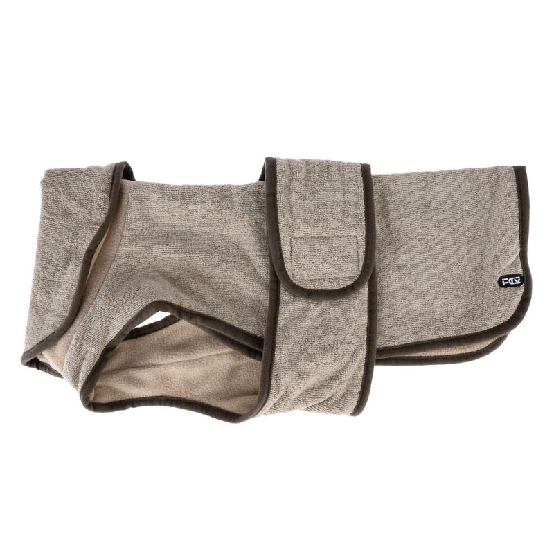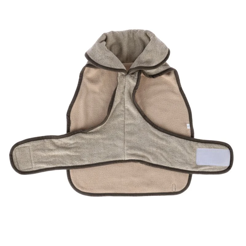 Cosy beige bathrobe for dogs, made of quick-drying microfibre fabric, with soft inner lining and practical Velcro fastener on the belly. Featuring a high turn-up collar and machine washable.