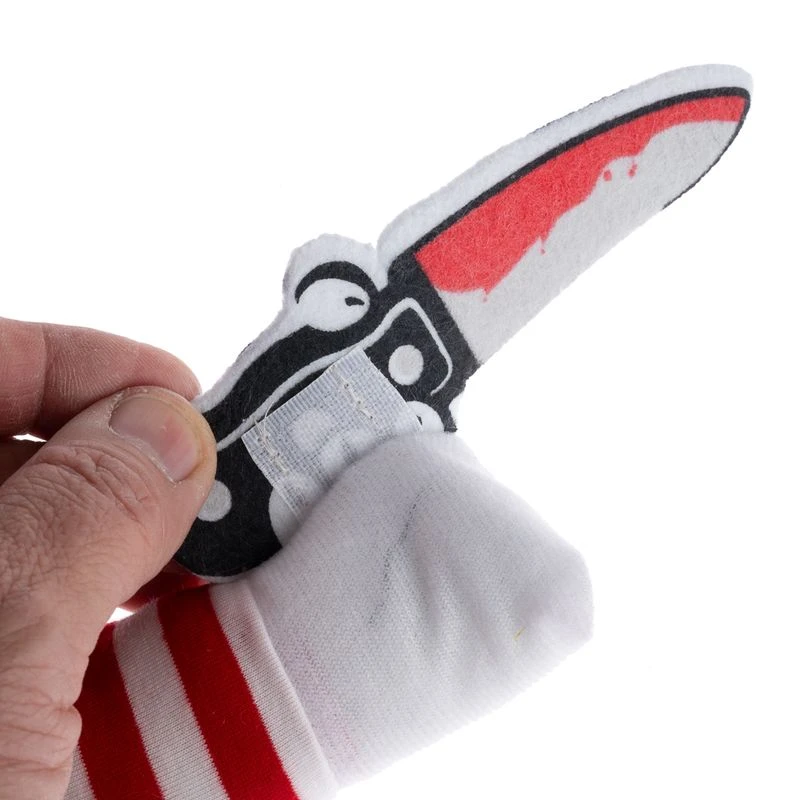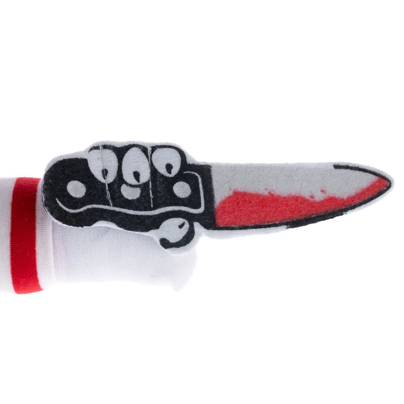 - Spooky design: fake arms, foam knife, and sewn-on values