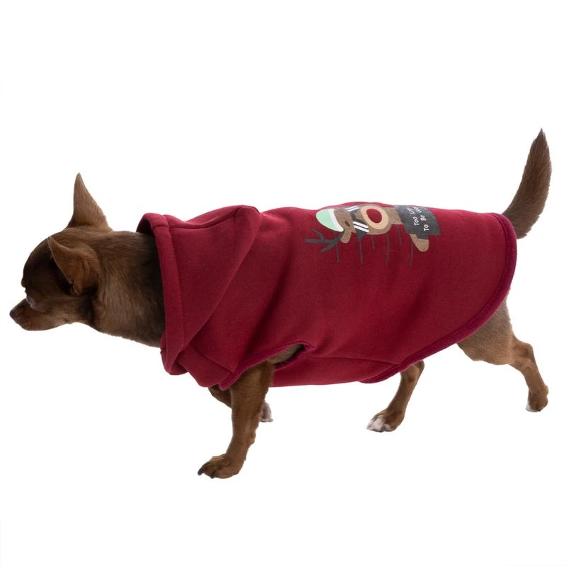 Cool hoodie for dogs, with casual “Too Late To Be Good” print on the back, made from soft sweatshirt material, pleasantly warm, easy to put on, wearable hood, colour: wine red.