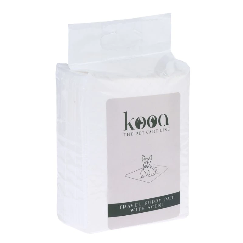 The kooa Travel Puppy Pads with Scent are an indispensable accessory for your dogs when travelling. These specially developed pads are ideal for puppies and offer a practical solution when travelling. They are particularly absorbent and store liquids reliably, so you don’t have to worry about wet paws. The subtle fresh fragrance ensures a pleasant environment, no matter where the journey takes you.